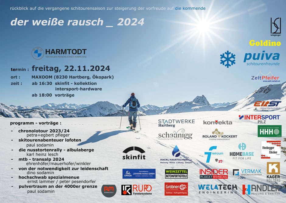 Die Zusammenkunft aller Schitourenfreunde um Rückschau zu halten auf die vergangene Saison zur Steigerung der Vorfreude auf die kommende - im Maxoom Hartberg am 18.11.2016